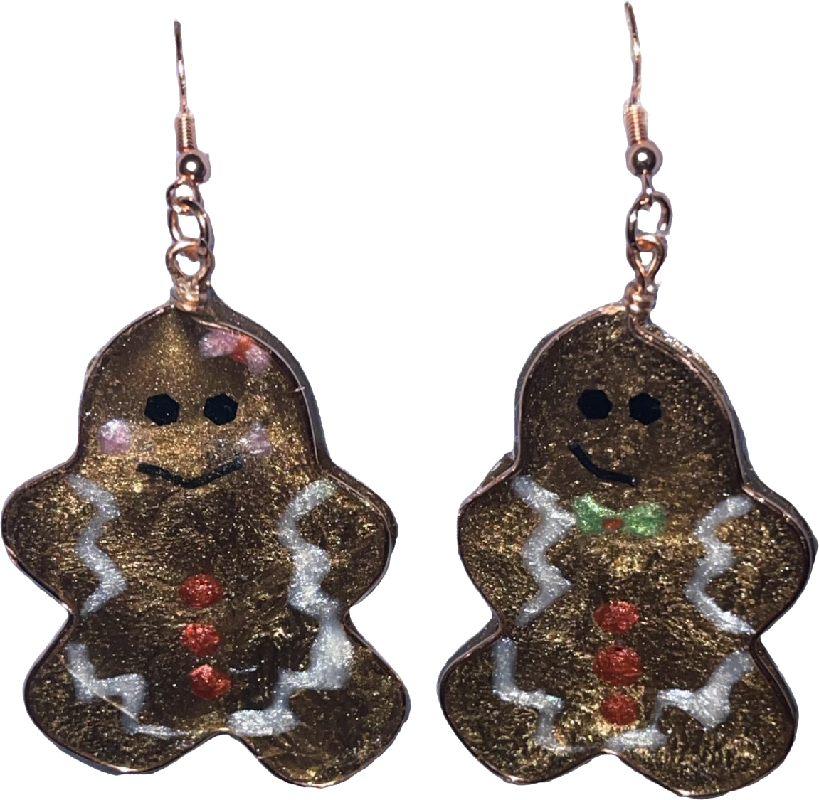 - Design: Adorable gingerbread man-shaped earrings with a sparkling golden glitter finish, complete with cheerful details such as a green bow tie, red buttons, and white icing accents, bringing a whimsical holiday charm.
