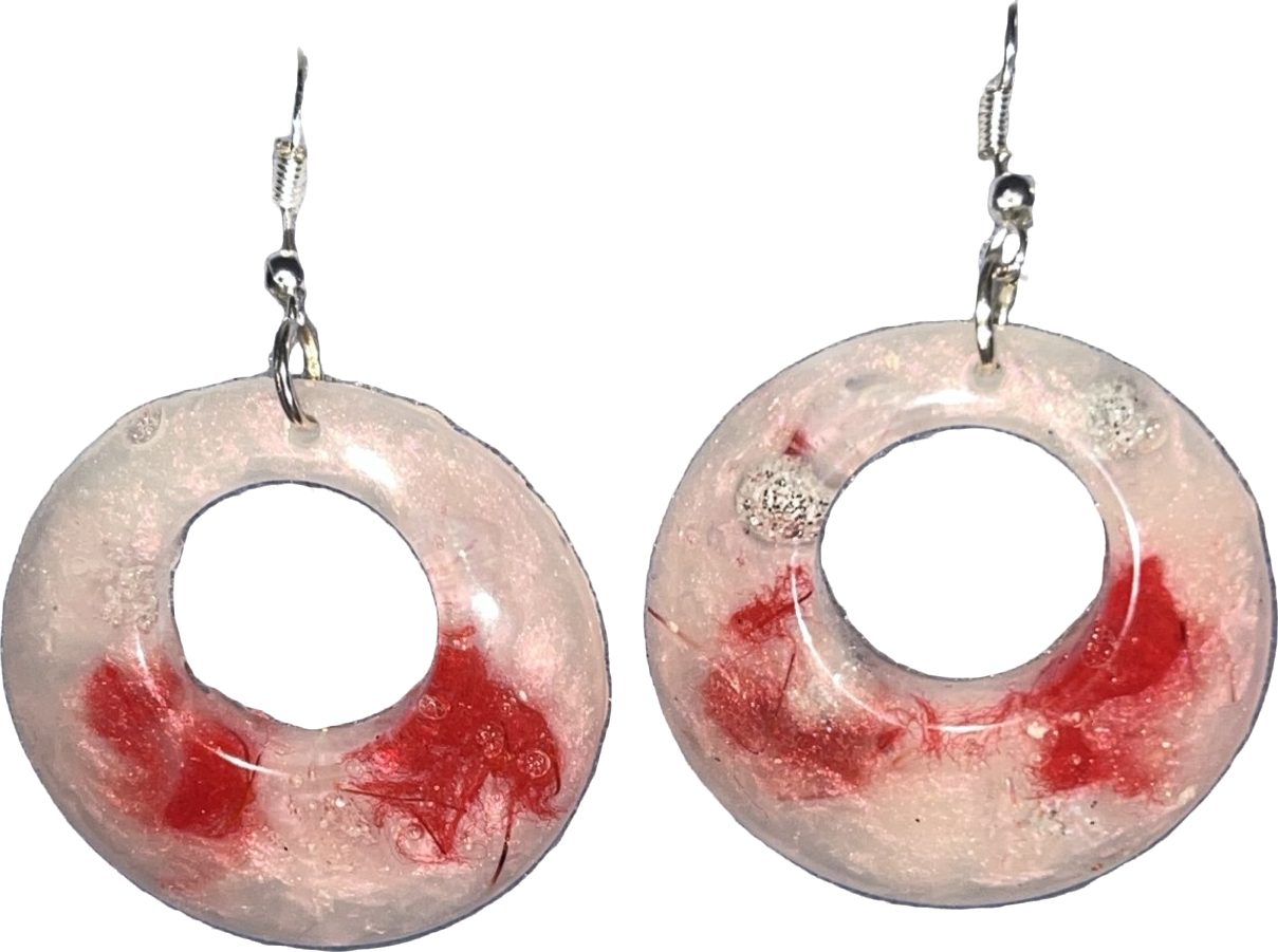 • Design: The "Scarlet Frost Hoops" earrings feature a delicate balance of bold and ethereal elements. Clear resin hoops are infused with shimmering frosty white accents, vivid scarlet threads, and subtle silver flakes, creating a striking, festive aesthetic.