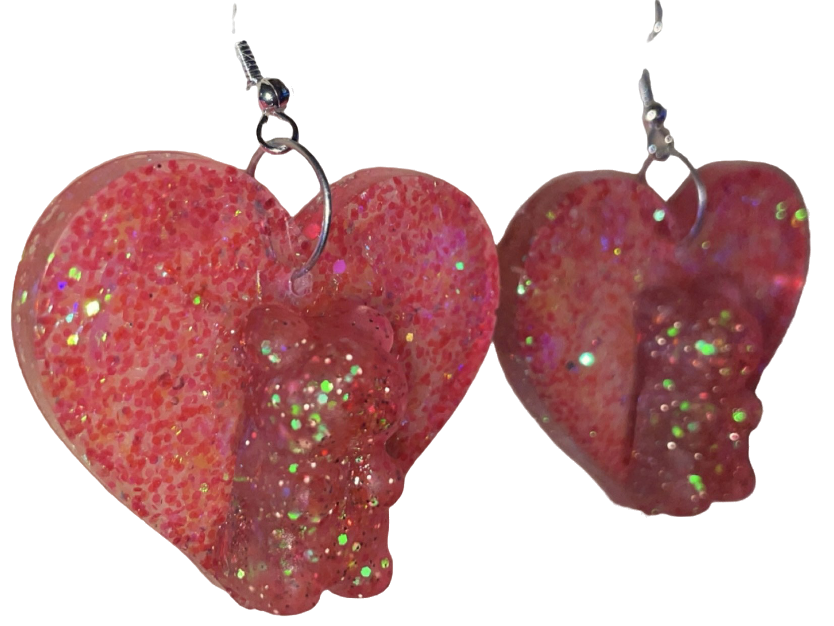 - Design: The Candy Bear Love earrings combine playful charm with a sweet aesthetic. Featuring a vibrant pink glittery heart as the backdrop, each earring showcases an adorable gummy bear-shaped resin charm in a translucent pink hue with a hint of sparkle.