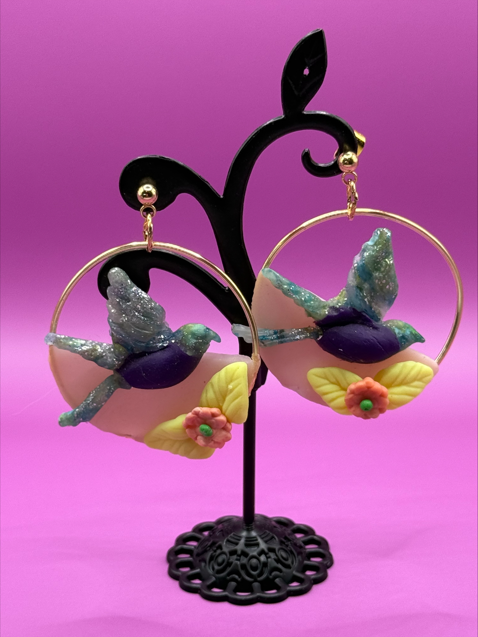 Vibrant hummingbirds with shimmering aqua wings and deep violet bodies soar across golden hoops. Surrounded by bright yellow leaves and coral flowers, these earrings bring a burst of botanical joy—perfect for springtime and nature lovers.