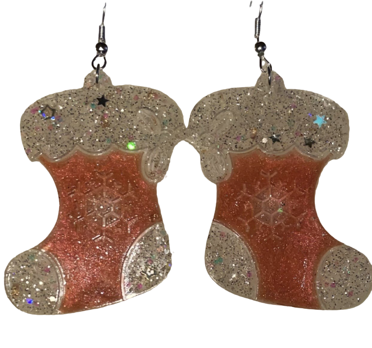 - Design: Festive stocking-shaped earrings with a dazzling glitter finish in red and gold tones, featuring snowflake detailing and multicolored sparkles for added holiday charm.