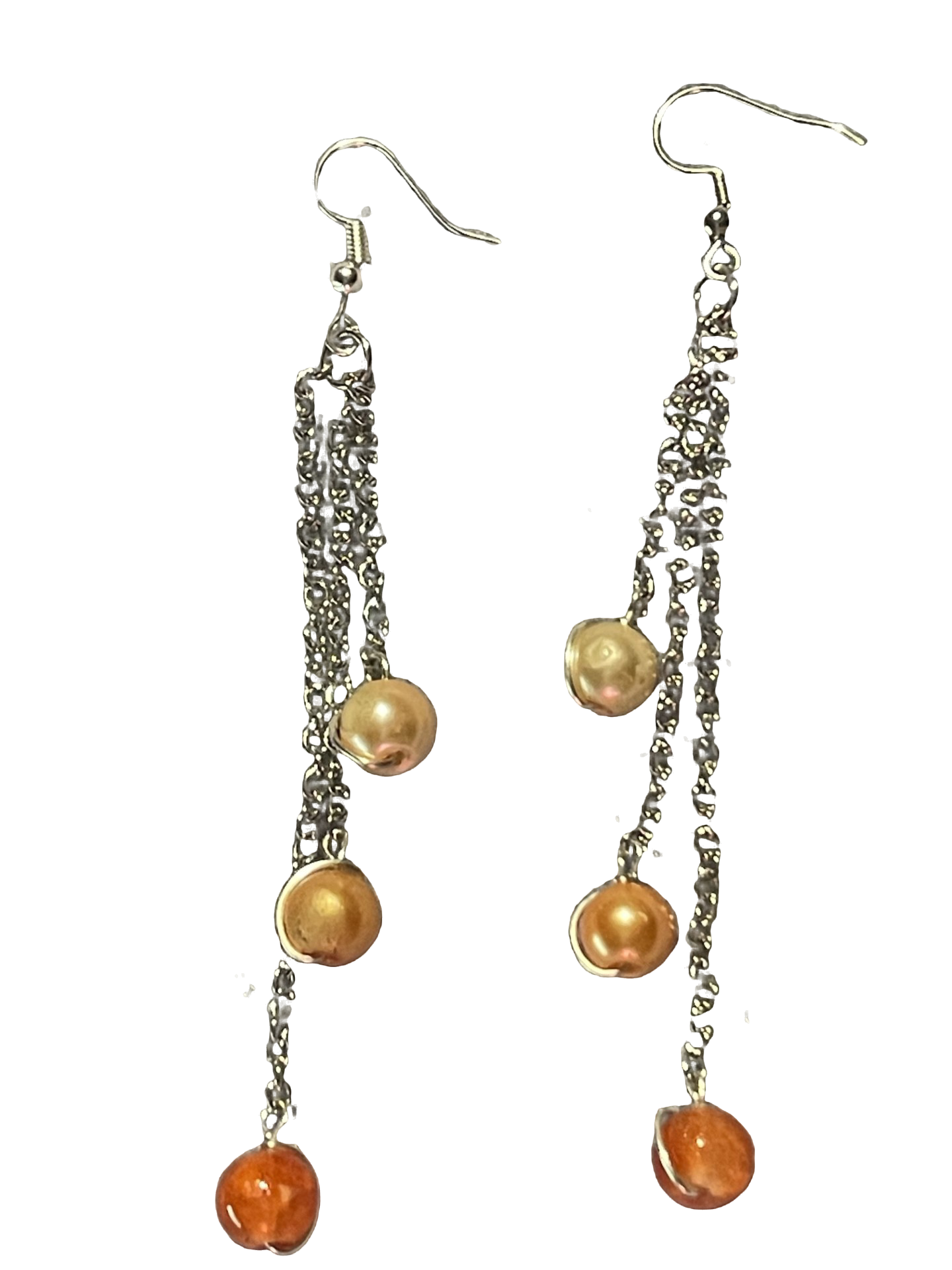 - Design: Elegant cascading earrings featuring multiple golden and amber-toned globes suspended on delicate silver-tone chains, creating a dynamic and eye-catching movement.