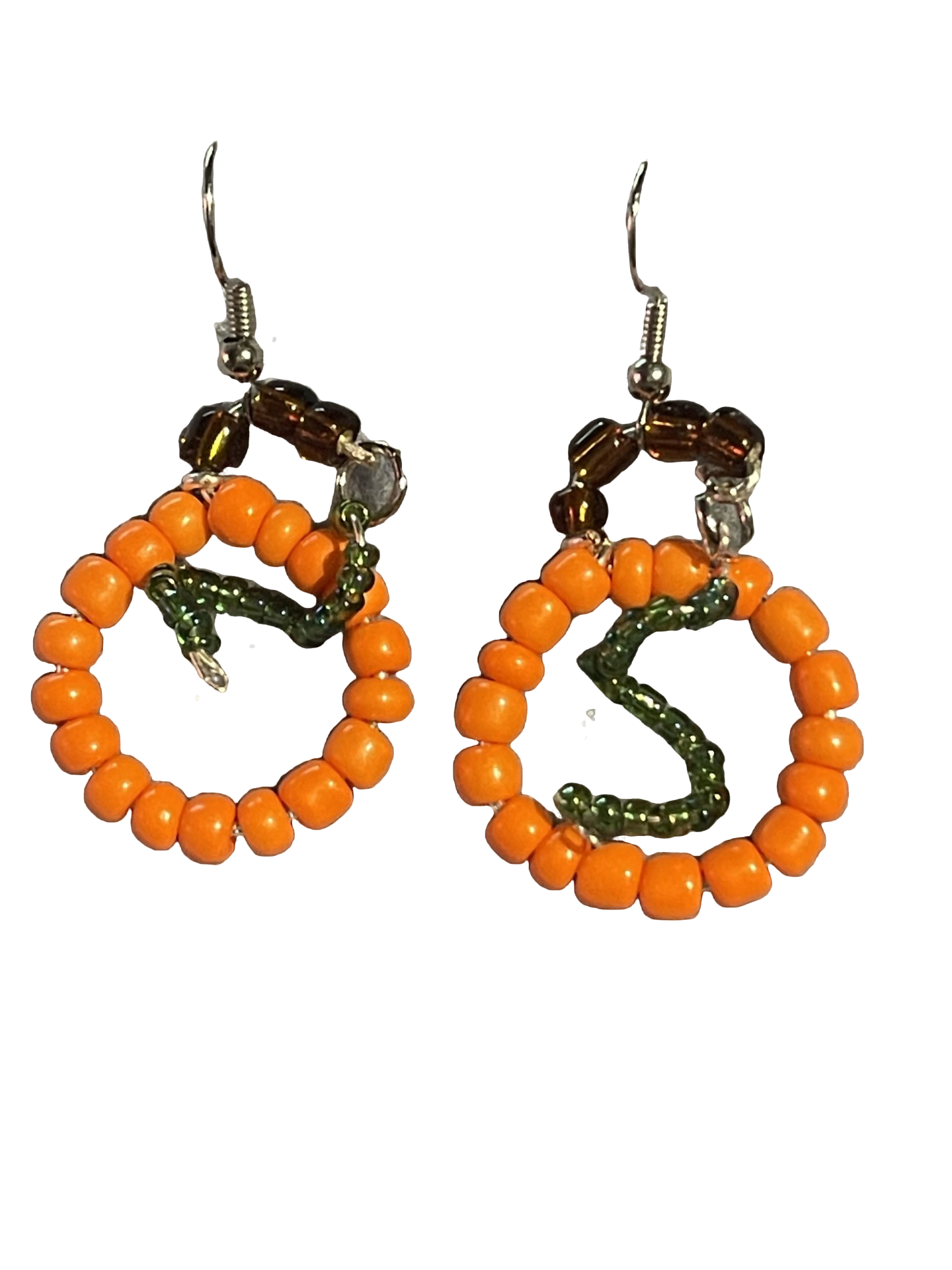 - Design: Playful and charming circular earrings shaped like miniature pumpkins, featuring vibrant orange beads and green bead accents for the stem and vines.