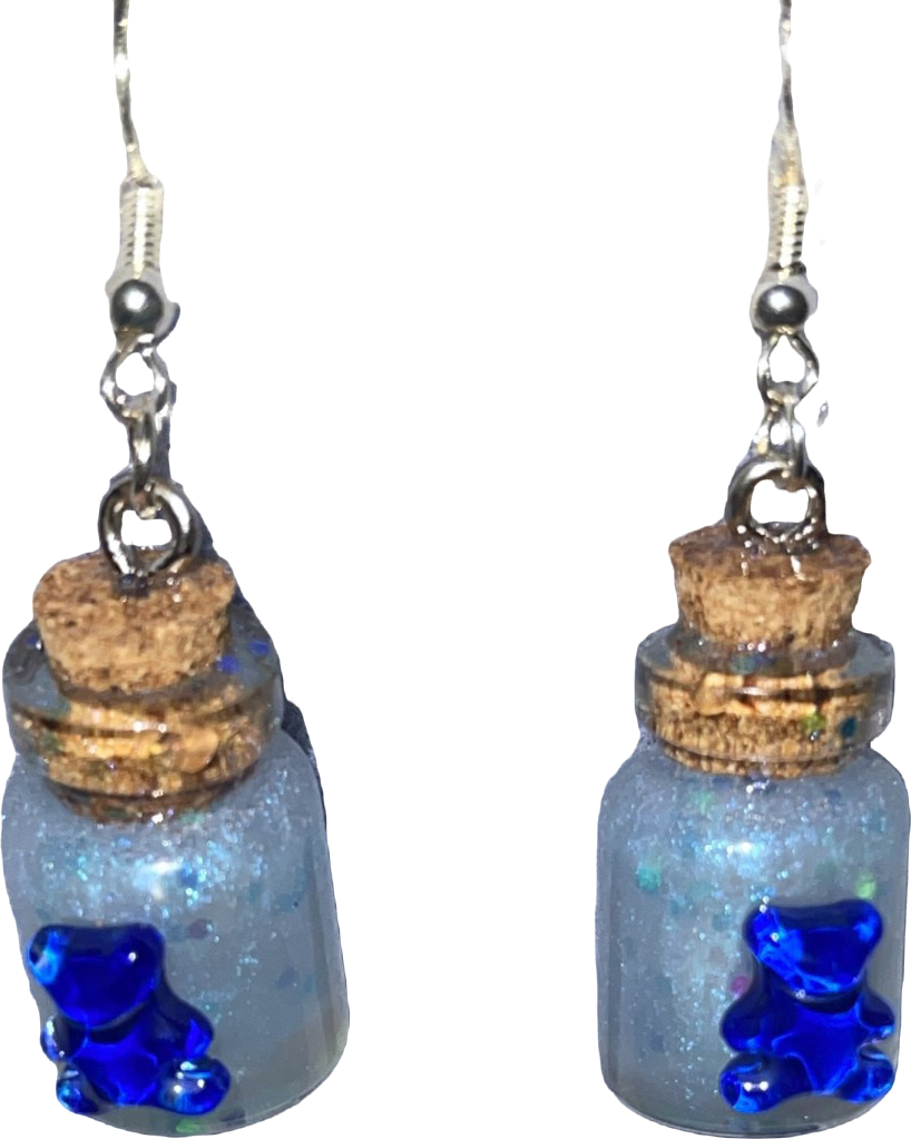 - Design: Unique miniature jar earrings with a cork stopper, filled with sparkling glitter and featuring an adorable blue bear figurine, creating a whimsical and enchanting accessory.