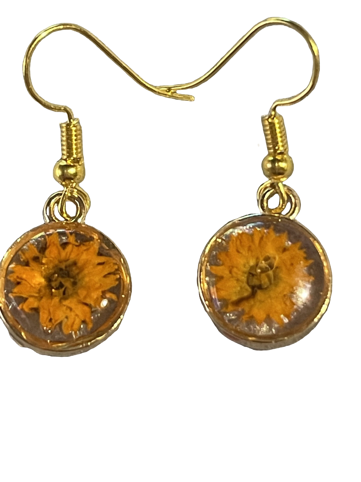 • Design: Stunning round earrings featuring real dried yellow flowers encased in crystal-clear resin, accented with gold-tone metal for an elegant and timeless look.