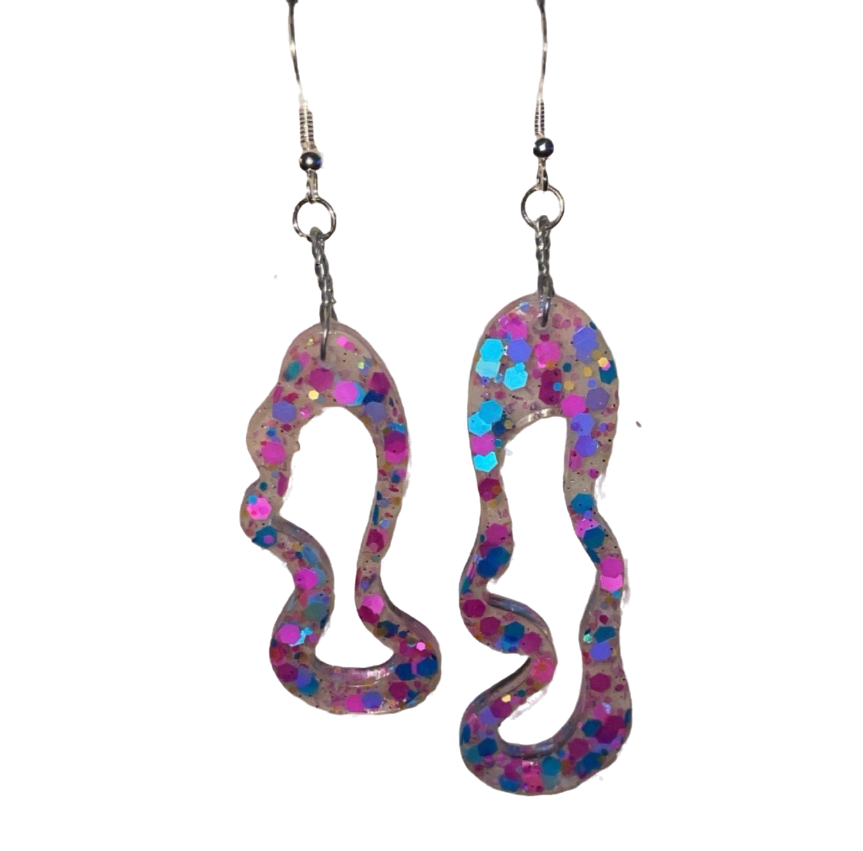 - Design: Introducing the Cosmic Wave earrings – a bold and fluid design that mimics the gentle curves of ocean waves with a futuristic, otherworldly twist. These earrings feature a translucent resin base embedded with dazzling multicolored holographic glitter in shades of pink, blue, and silver, creating an iridescent sparkle that shifts with every angle.
