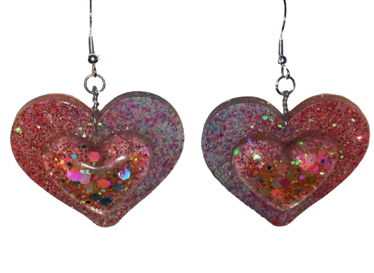 • Design: The Double Glitter Heart earrings feature a charming, layered heart design that bursts with vibrant, sparkling energy. Each earring showcases two hearts – a larger glitter-filled heart as the base and a smaller, raised translucent heart embedded with colorful sequins and iridescent flecks. This unique, multi-dimensional style creates a playful and eye-catching look.