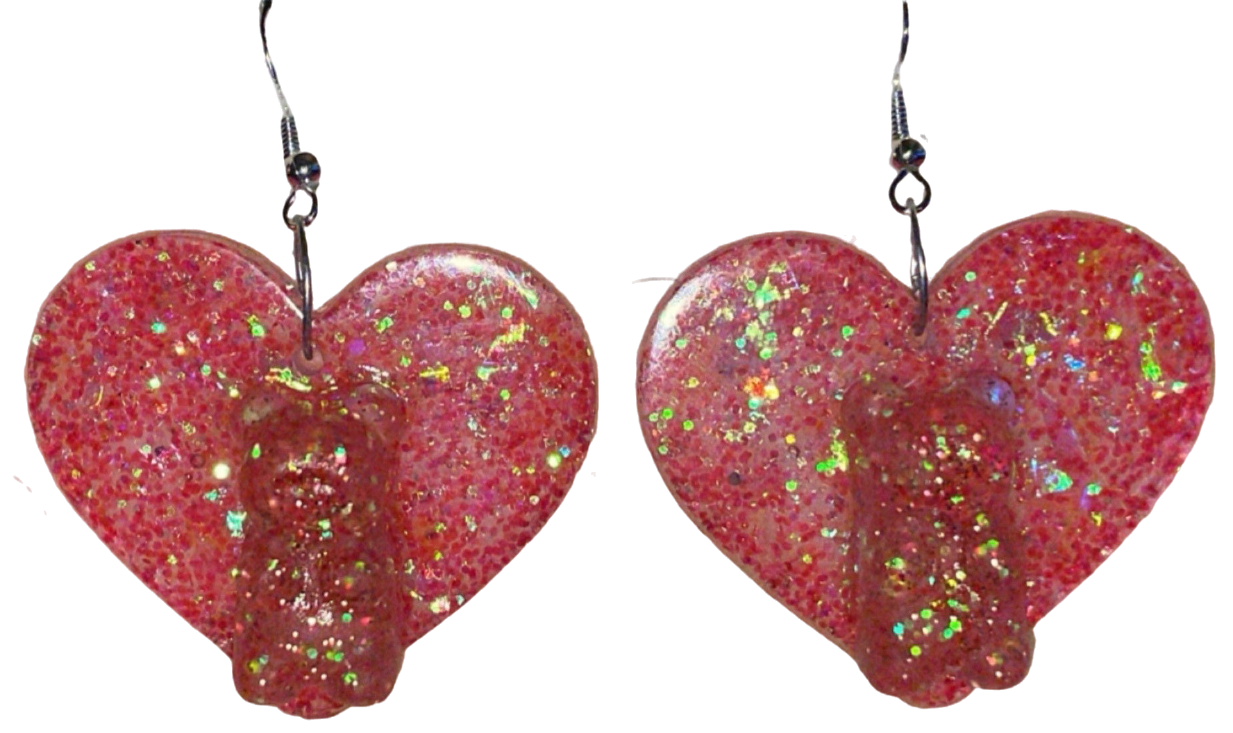 - Design: The Candy Bear Love earrings combine playful charm with a sweet aesthetic. Featuring a vibrant pink glittery heart as the backdrop, each earring showcases an adorable gummy bear-shaped resin charm in a translucent pink hue with a hint of sparkle.