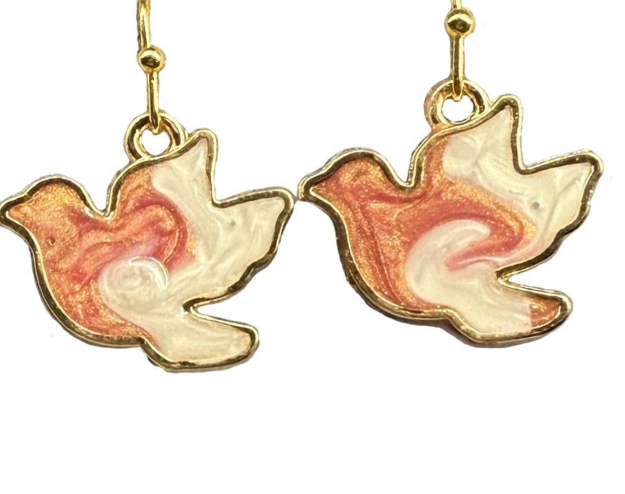 - Design: The Wings of Peace earrings feature graceful dove silhouettes symbolizing hope and harmony. The hand-painted marbled design blends warm shades of coral and pearl white, creating an elegant, flowing effect that mimics the beauty of flight.