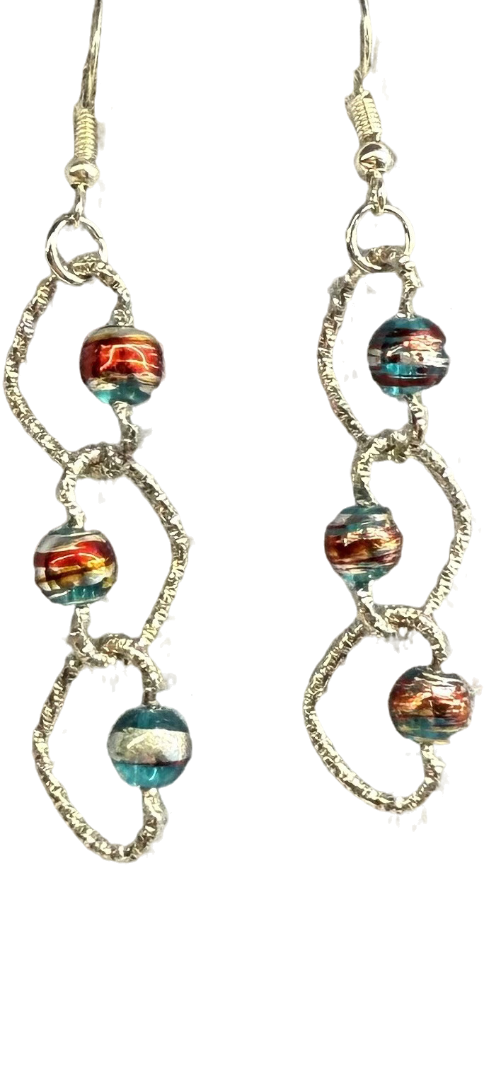 - Design: The Celestial Spiral earrings feature a captivating double-helix design adorned with vibrant, hand-crafted glass beads in rich hues of turquoise, amber, and gold, reminiscent of cosmic beauty.