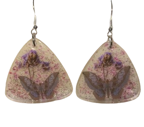 - Design: The Twilight Wing Whispers earrings capture the ethereal beauty of dusk, featuring delicately preserved butterfly wings suspended against a soft floral backdrop. The triangular resin setting adds a modern touch, while subtle specks of iridescent shimmer evoke the quiet magic of twilight.